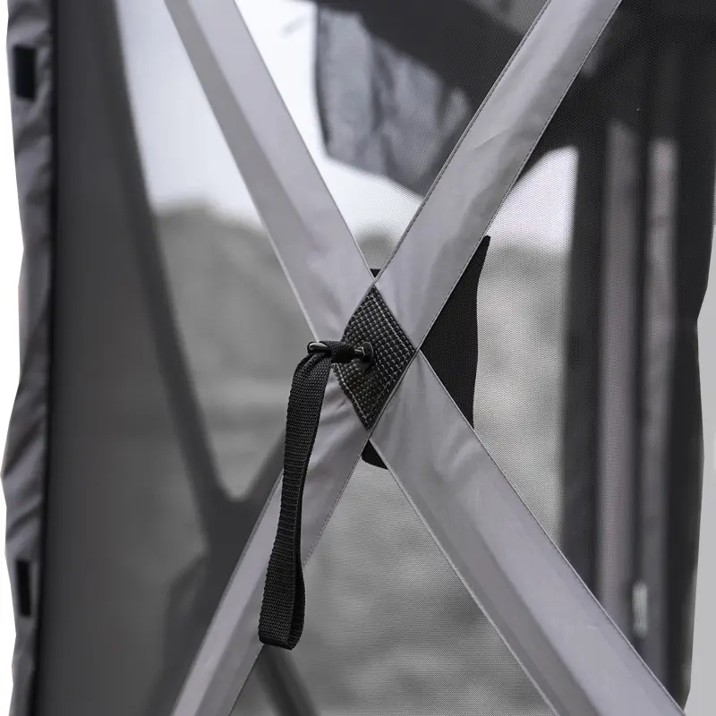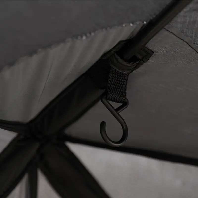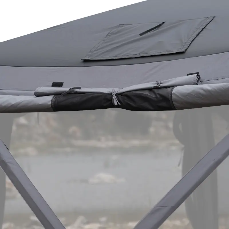 Struktura HUB lejon montim në pak minuta pa shtylla tradicionale. Korniza fiberglass e fortë mban formën stabile edhe në kushte me erë. Me dimensione 366 × 366 × 218 cm, krijon një hapësirë shumë të madhe ku mund të vendosen tavolinë, karrige, pajisje gatimi apo sobë kampingu.
