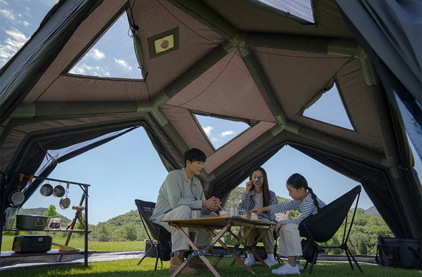Është projektuar si “hub” – pra si bërthama e kampit, ku mblidhet familja ose grupi. Hapësira e brendshme është e madhe, e hapur dhe shumë fleksibël: mund të përdoret si sallon, zonë ngrënieje, kuzhinë kampingu apo edhe si tendë më vete.