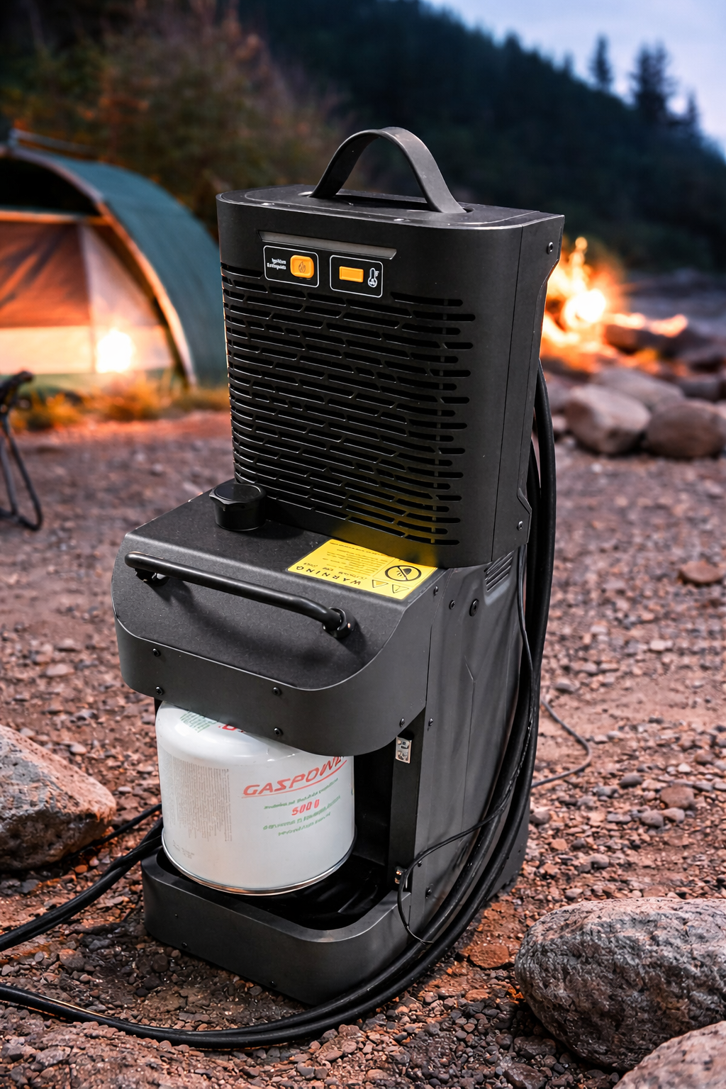 Funksionon me bombolë gazi 500g (si në foto) dhe ofron ndezje të shpejtë me buton “Ignition”. Pajisja ka sistem ventilimi frontal për shpërndarje të njëtrajtshme të nxehtësisë dhe dorezë transporti për lëvizje të lehtë.