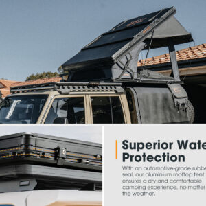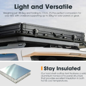 Struktura e jashtme është ndërtuar me hard shell alumini me panel honeycomb, një material shumë i fortë dhe i lehtë që përdoret në pajisjet profesionale të overlanding. Materiali i çadrës është 420D Double Ripstop Oxford + 280GT polyester-cotton, i cili ofron rezistencë ndaj ujit 5000 mm dhe mbrojtje UV50+, duke e bërë të përshtatshme për çdo sezon.