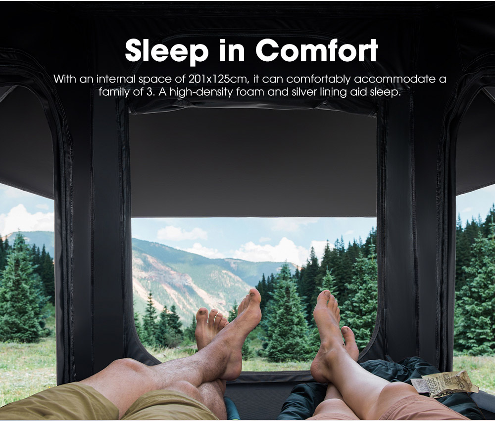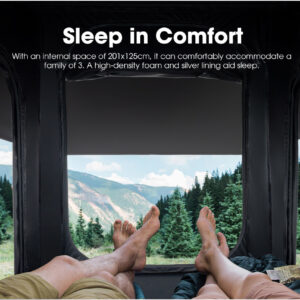Brenda çadrës ndodhet një dyshek memory foam 5 cm me anti-condensation mat, që përmirëson qarkullimin e ajrit dhe garanton gjumë shumë të rehatshëm gjatë natës. Hapësira e brendshme është projektuar për 2–3 persona, duke ofruar komoditet për çiftet ose familjet e vogla.
