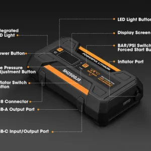 Jump Starter SH2500JS është një pajisje multifunksionale e fuqishme që kombinon starter baterie, kompresor ajri, power bank dhe ndriçim LED në një trup kompakt. I përshtatshëm për makina benzine dhe nafte, SUV, furgona dhe mjete off-road.