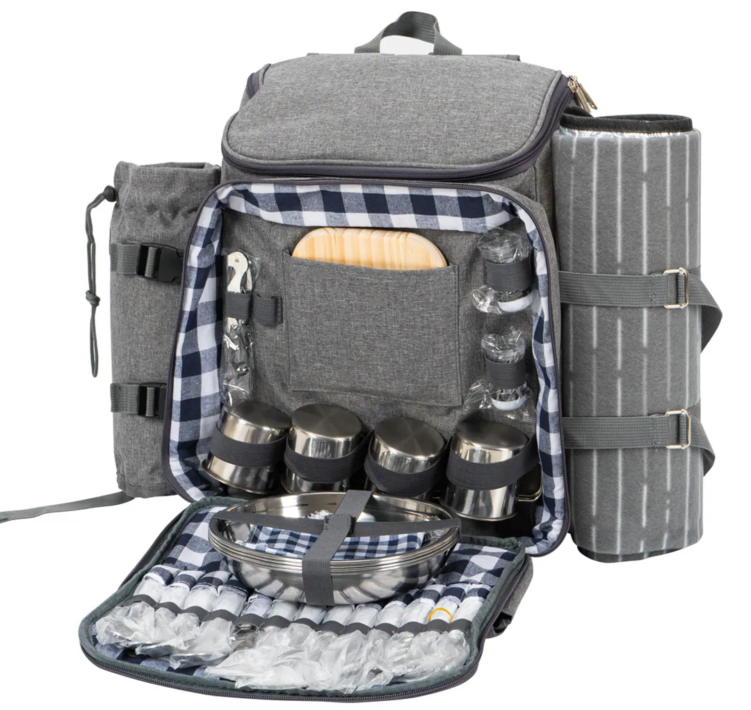 Seti kombinon backpack rezistent prej Oxford Cloth, tavolinë të vogël portative, tapet anti-lagështi dhe komplet enësh ngrënieje. Brenda çantës ka shtresë izoluese (silver lining) për të mbajtur pijet dhe ushqimin më të freskët, ndërsa çdo aksesor ka vendin e vet të fiksuar.