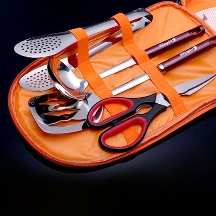 Seti përfshin mjetet bazë të gatimit si thikë inox, lugë, spatulë, gërshërë dhe aksesorë të tjerë, të gjitha të fiksuara në ndarje të veçanta për transport të sigurt.