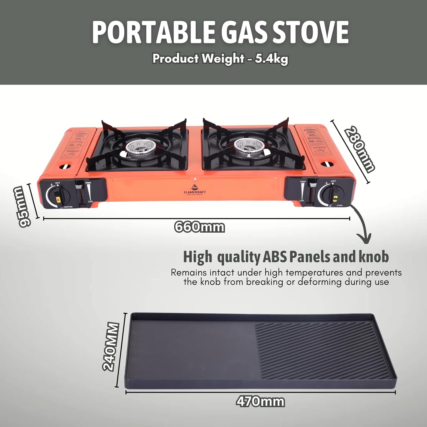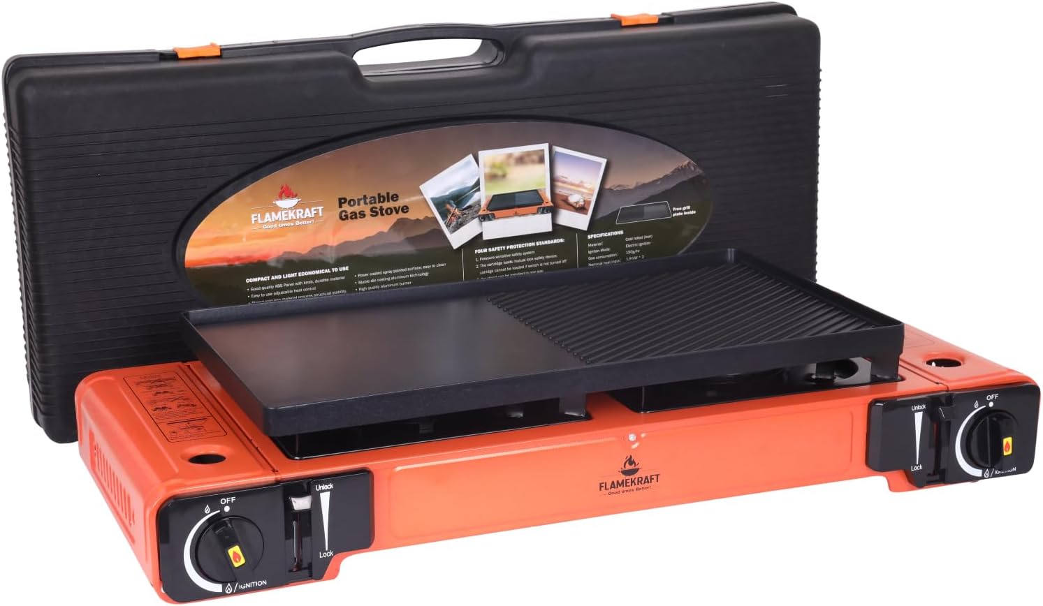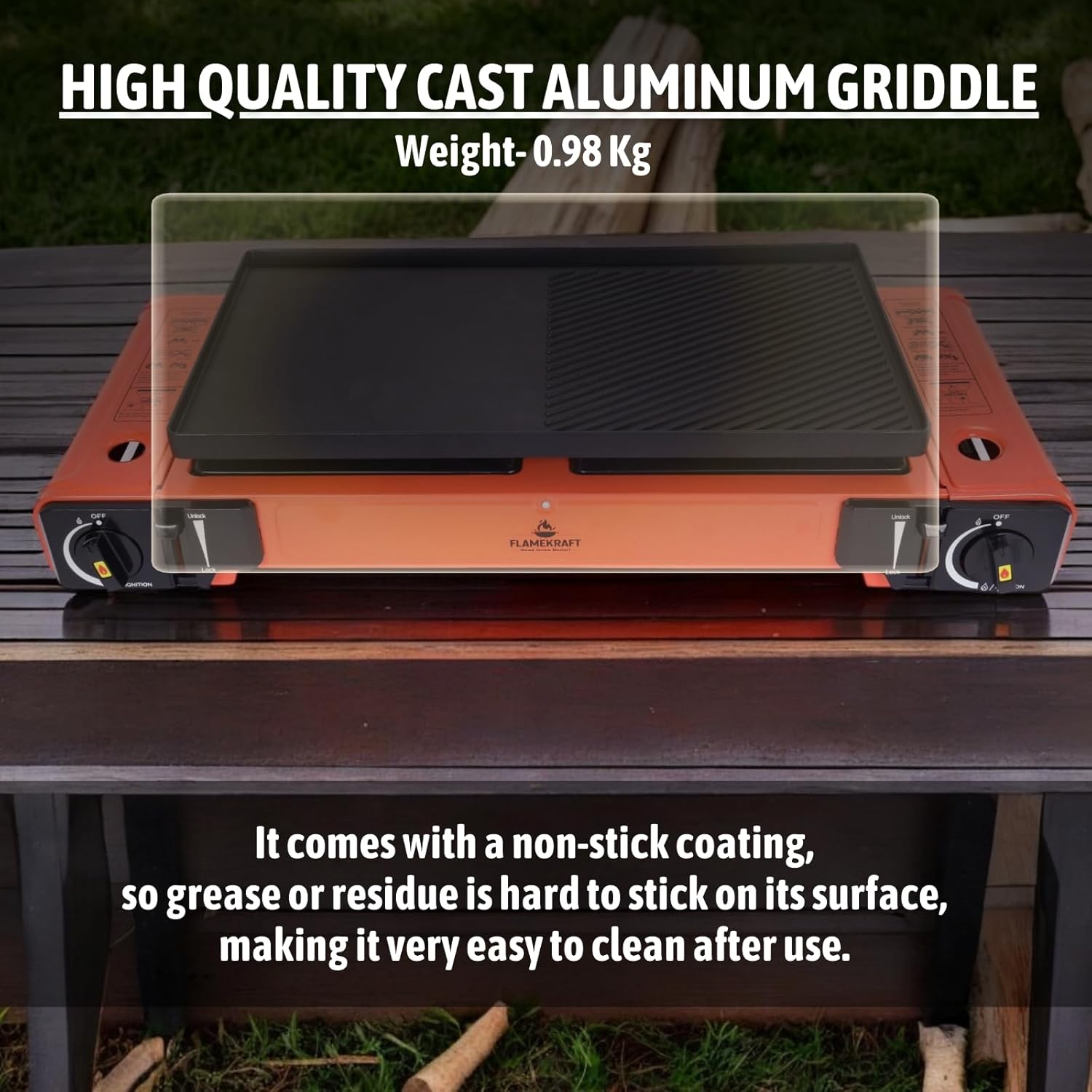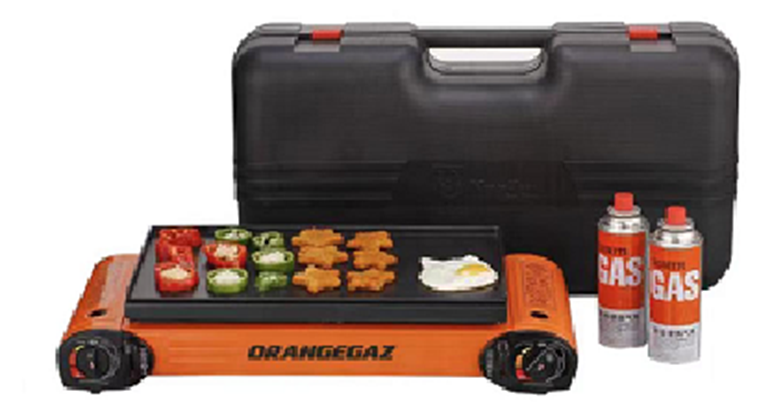 Sipërfaqja e sipërme përfshin një pllakë gatimi (grill plate) e cila është ideale për përgatitjen e mishit, perimeve, vezëve apo ushqimeve të tjera gjatë kampingut. Struktura është ndërtuar me çelik inox dhe material plastik rezistent ndaj temperaturës, duke garantuar qëndrueshmëri dhe jetëgjatësi.