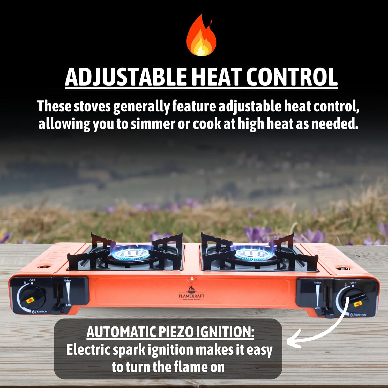 Double Stove Camping Gas Stove FX-8488-2 është një sobë portative kampingu me dy vatra, e projektuar për gatim të shpejtë dhe praktik gjatë aktiviteteve outdoor si kamping, piknik, udhëtime me makinë, peshkim apo barbecue në natyrë.